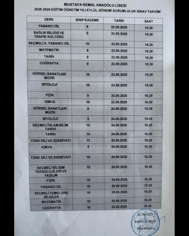 2025-2026 Eğitim ve Öğretim Yılı Eylül Dönemi Sorumluluk Sınavı tarihleridir.